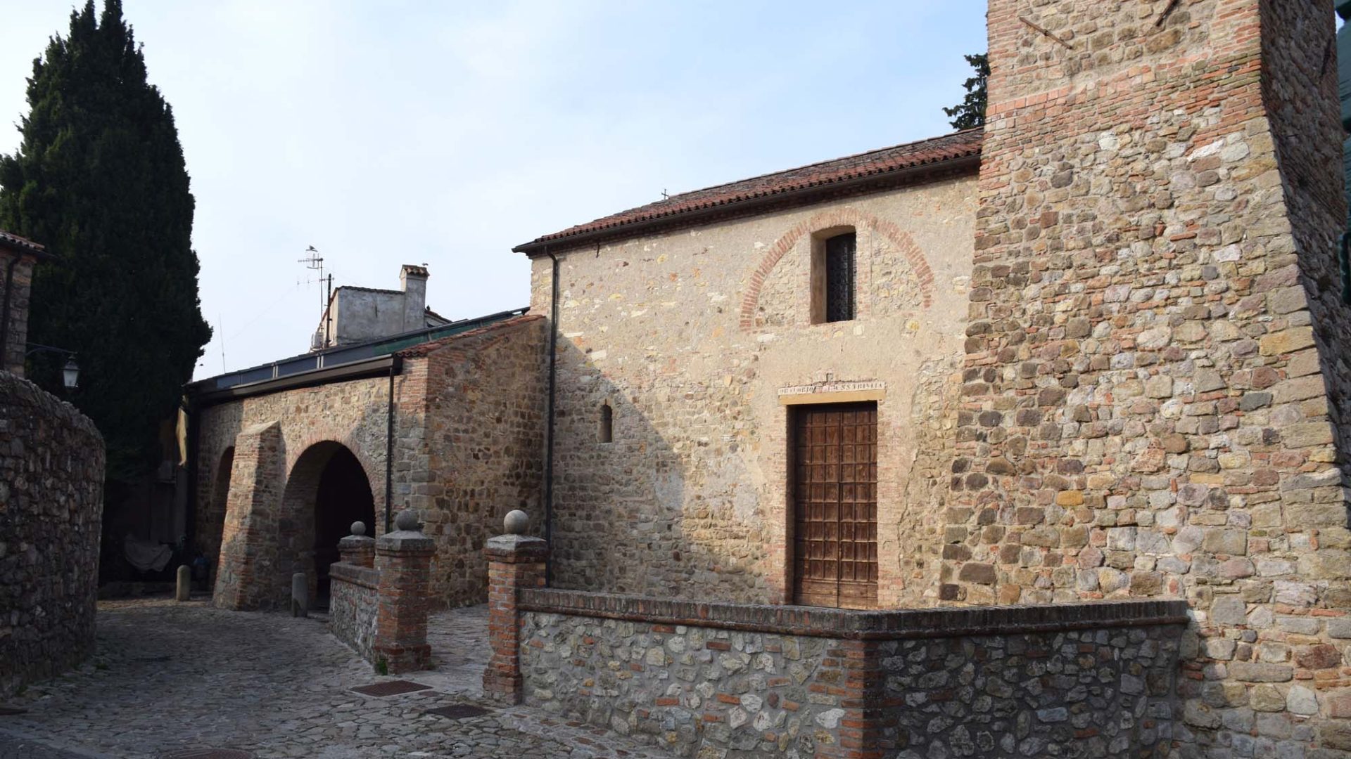 Un documento datato al 1181 rappresenta la prima testimonianza dell’esistenza dell’Oratorio della Santissima Trinità di Arquà ma è probabile che l’edificio esistesse già in precedenza. L’originaria chiesa romanica subì, nel corso dei secoli, alcuni importanti rimaneggiamenti: nel Trecento venne ampliata e decorata con affreschi parietali di cui oggi si conservano solo pochissime tracce, mentre nel secolo successivo venne aggiunta l’abside. L’Oratorio era frequentato anche dal Petrarca, che era solito recarvisi in preghiera, abitandovi a poca distanza. All’interno dell’attuale edificio, realizzato in stile romanico, a unica navata e con tetto a capanna in travi lignee a vista, sono custodite alcune pregevoli opere d’arte tra cui la pala d’altare raffigurante la Trinità, opera di Palma il Giovane (vissuto tra il 1544 e il 1628), il polittico trecentesco di Sant’Agostino, di Jacobello di Bonomo, e i dipinti del Seicento raffiguranti “la trasmissione del bastone di vicario che Antonio degli Oddi fa a Daniele degli Oddi” e “la Città di Padova nell’atto di rendere omaggio a un vescovo martire”, di Giovanni Battista Pellizzari.